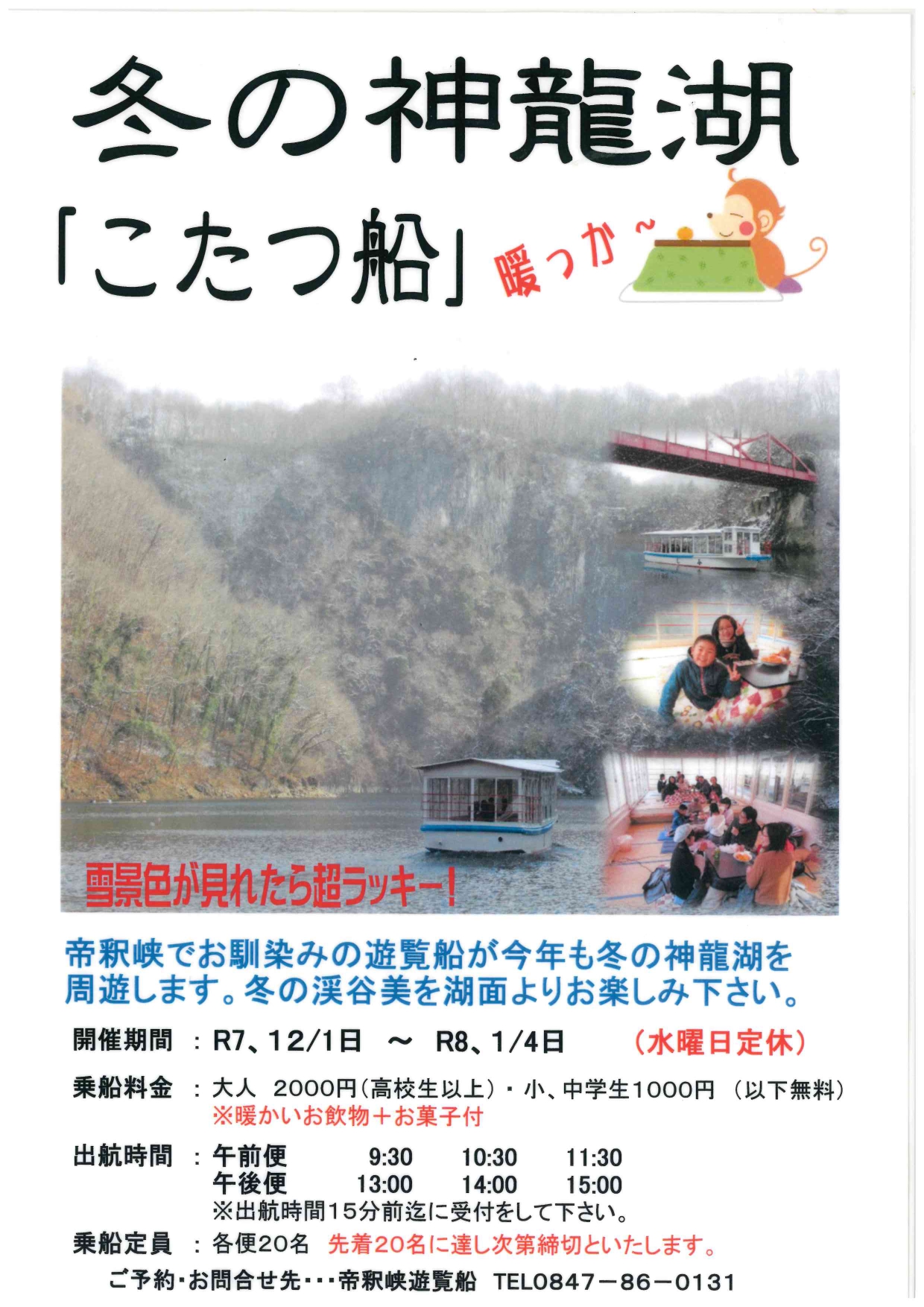 帝釈峡遊覧船が12月1日からは人気のこたつ船プランになります。
