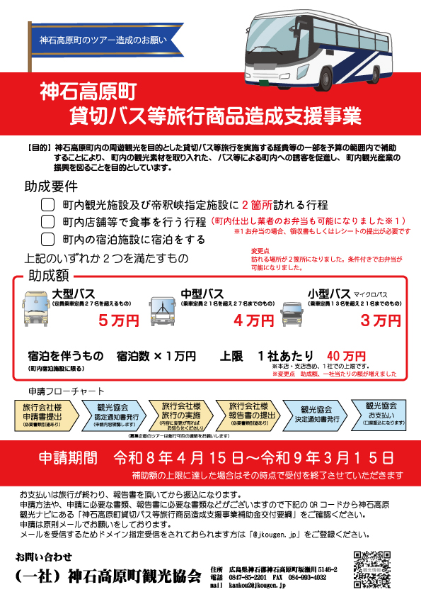 令和8年も旅行事業者様に神石高原町内の周遊観光を目的とした貸切バス等旅行商品造成に支援いたします。補助金の申請について詳しくは要綱をご確認いただき申請をお願いいたします。